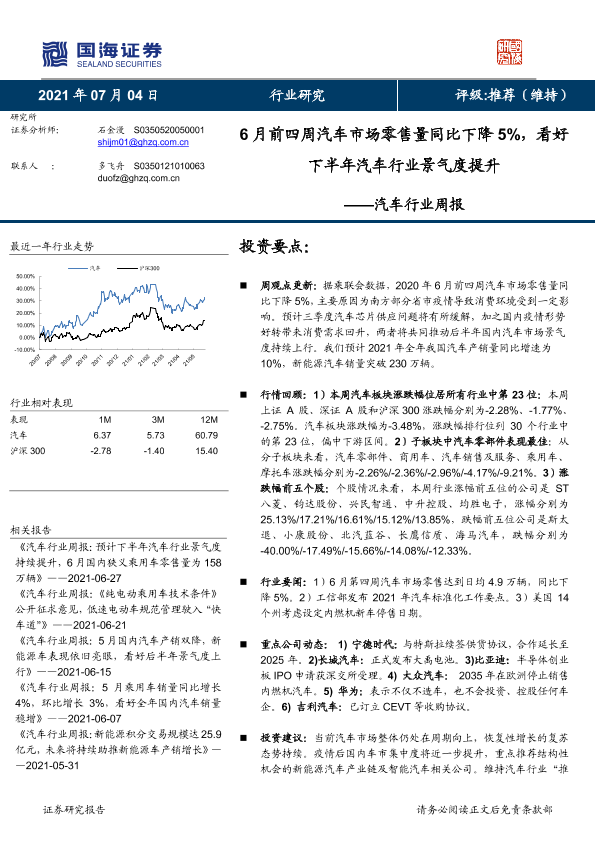 【国海证券】【20210704】20210704-国海证券-汽车行业周报:6月前四周汽车市场零售量同比下降5%,看好下半年汽车行业景气度提升-12页