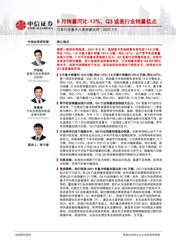 【中信证券】【20210705】20210705-中信证券-汽车行业重卡月度销量点评:6月销量同比-13%,Q3或是行业销量低点-4页
