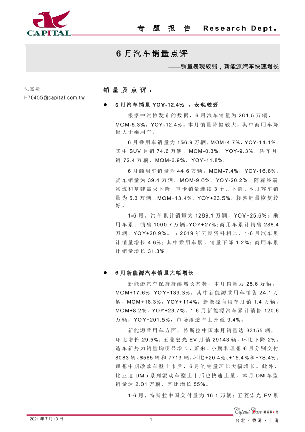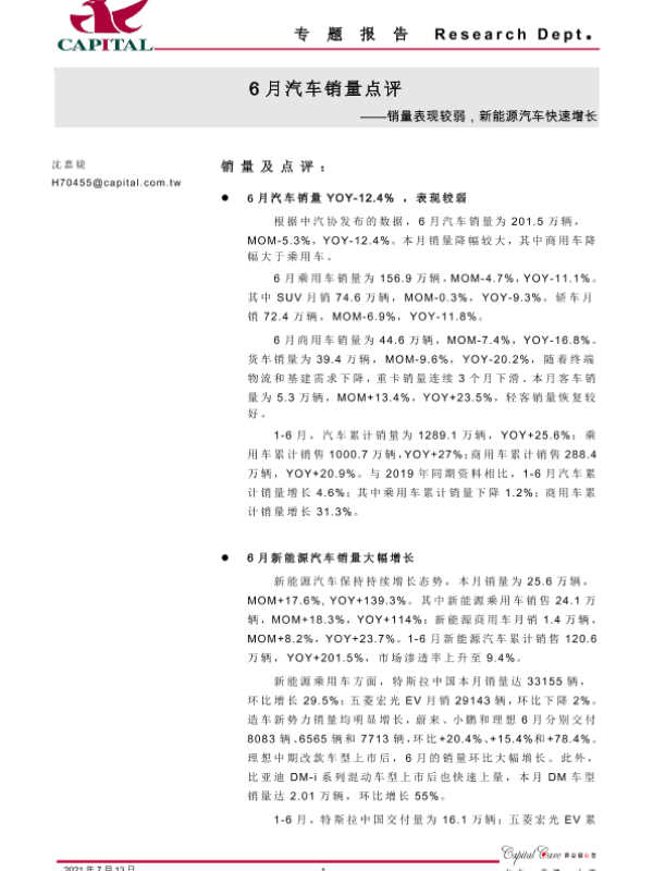 【群益证券】【20210713】6月汽车销量点评:销量表现较弱,新能源汽车快速增长-3页