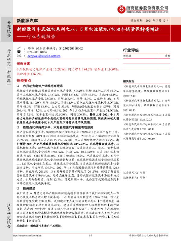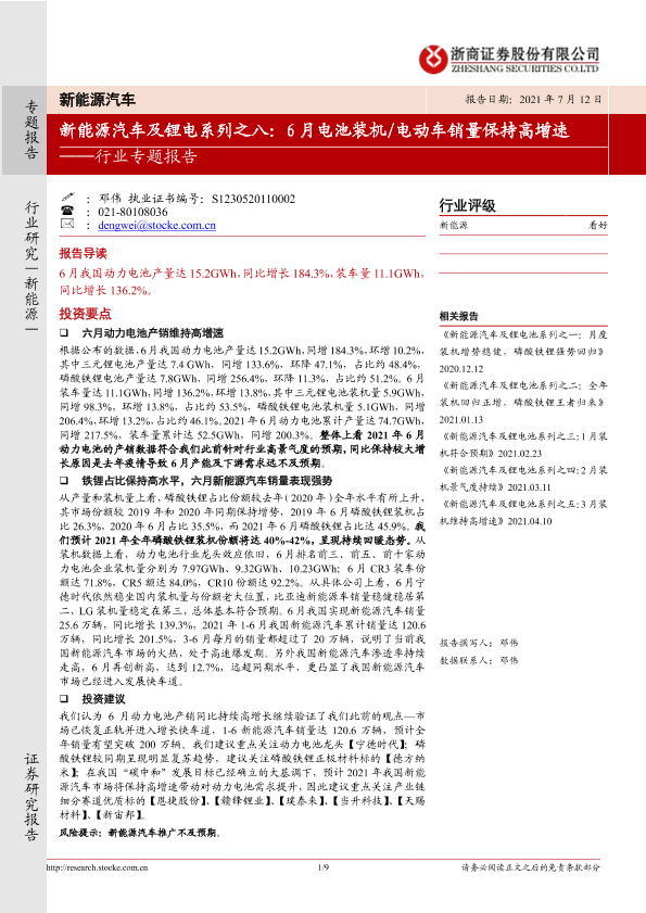 【浙商证券】【20210712】新能源汽车及锂电系列之八:6月电池装机 电动车销量保持高增速-9页
