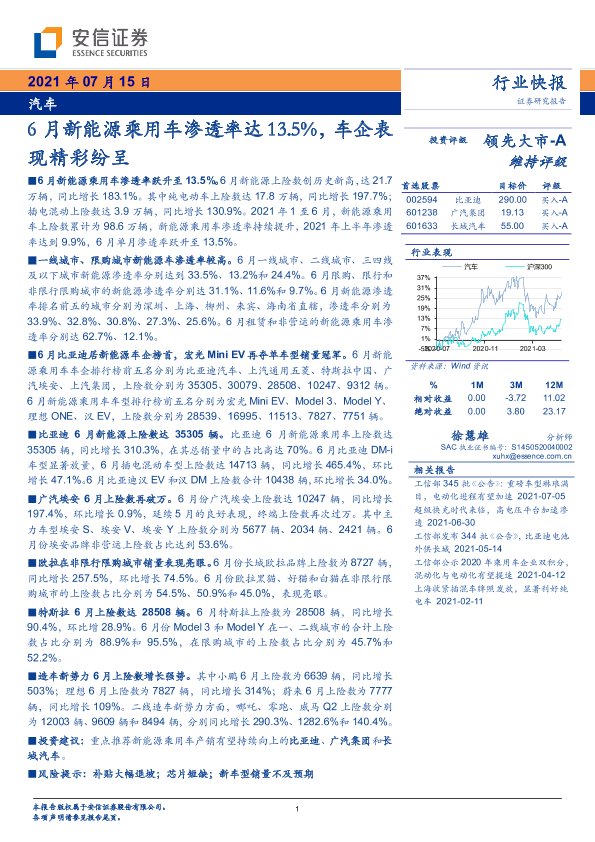 【安信证券】【20210715】6月新能源乘用车渗透率达13.5%,车企表现精彩纷呈-23页
