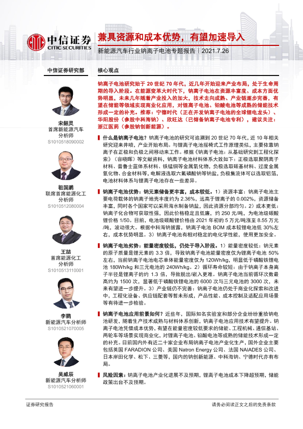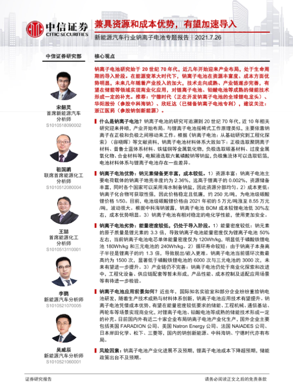 【中信证券】【20210726】新能源汽车行业钠离子电池专题报告:兼具资源和成本优势,有望加速导入-14页
