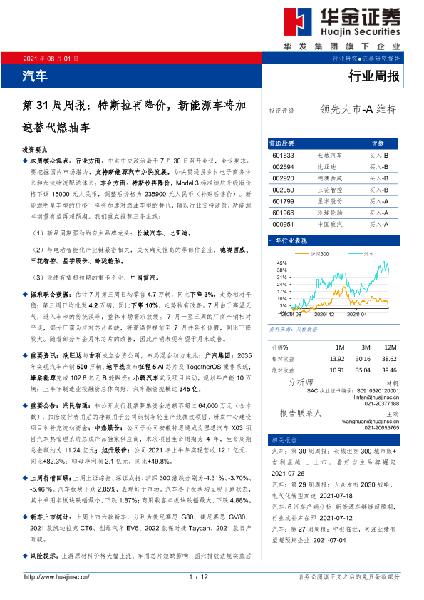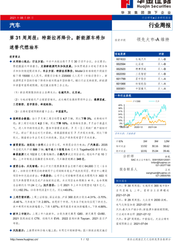 【华金证券】【20210801】汽车第31周周报:特斯拉再降价,新能源车将加速替代燃油车-12页