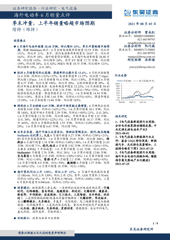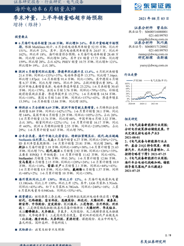 【东吴证券】【20210803】海外电动车6月销量点评:季末冲量,上半年销量略超市场预期-9页