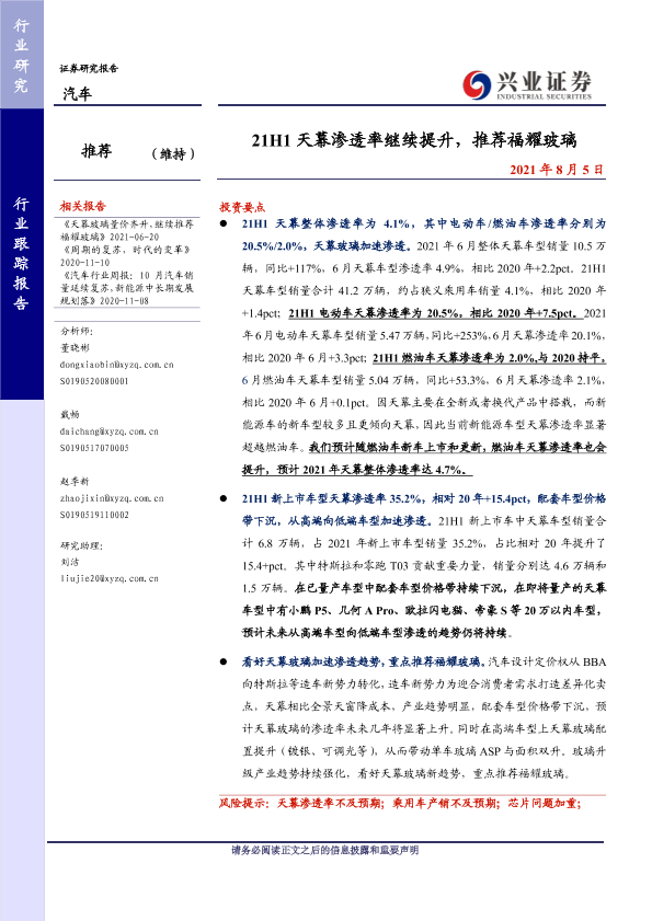 【兴业证券】【20210805】21H1天幕渗透率继续提升,推荐福耀玻璃-4页