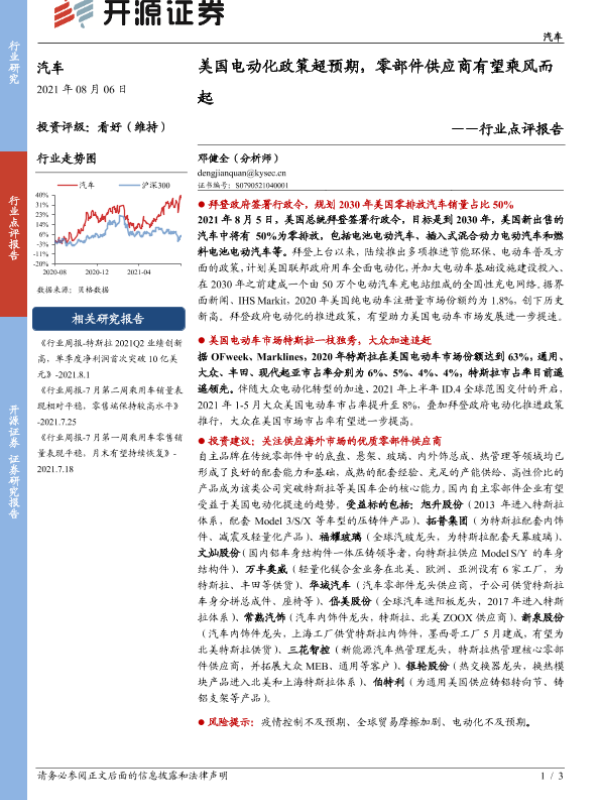 【开源证券】【20210806】汽车行业点评报告:美国电动化政策超预期,零部件供应商有望乘风而起-3页