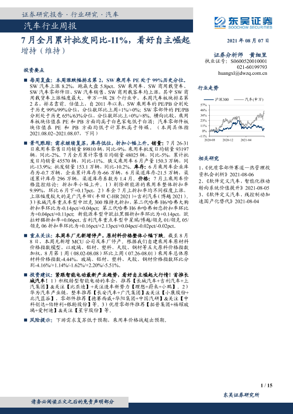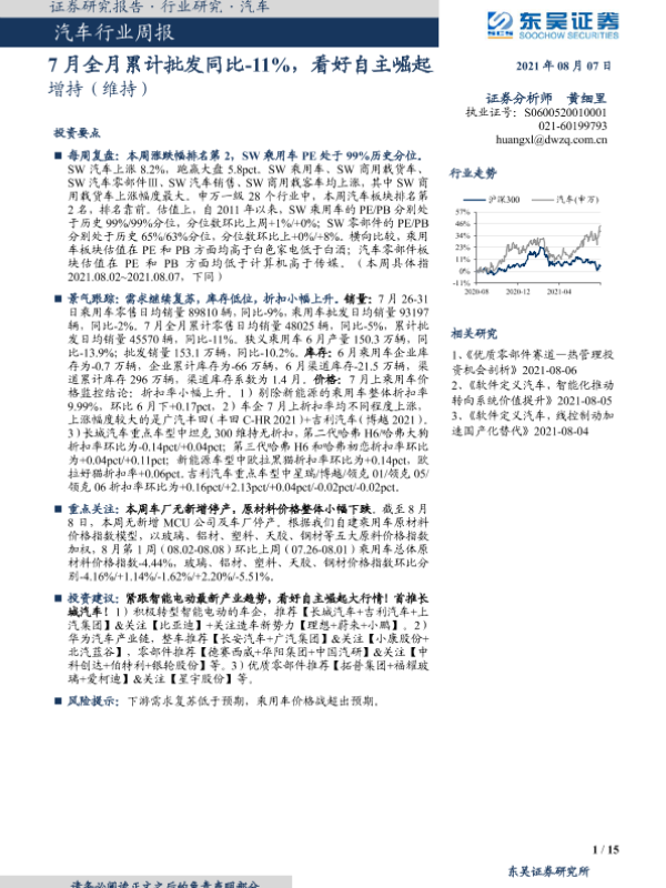 【东吴证券】【20210807】20210807-东吴证券-汽车行业周报:7月全月累计批发同比-11%,看好自主崛起-15页