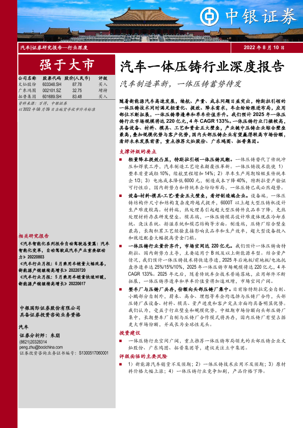 【中银证券】【20220810】汽车一体压铸行业深度报告:汽车制造革新,一体压铸蓄势待发-50页