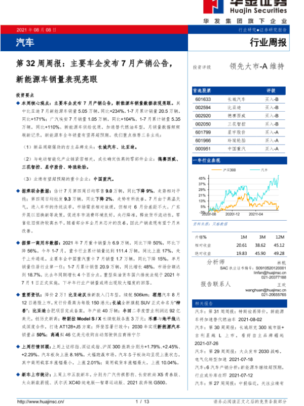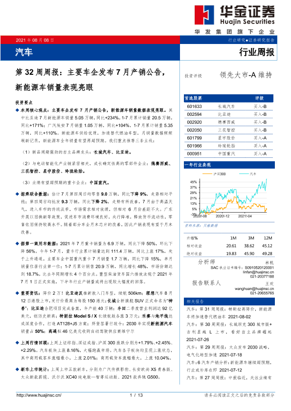 【华金证券】【20210808】汽车第32周周报:主要车企发布7月产销公告,新能源车销量表现亮眼-13页