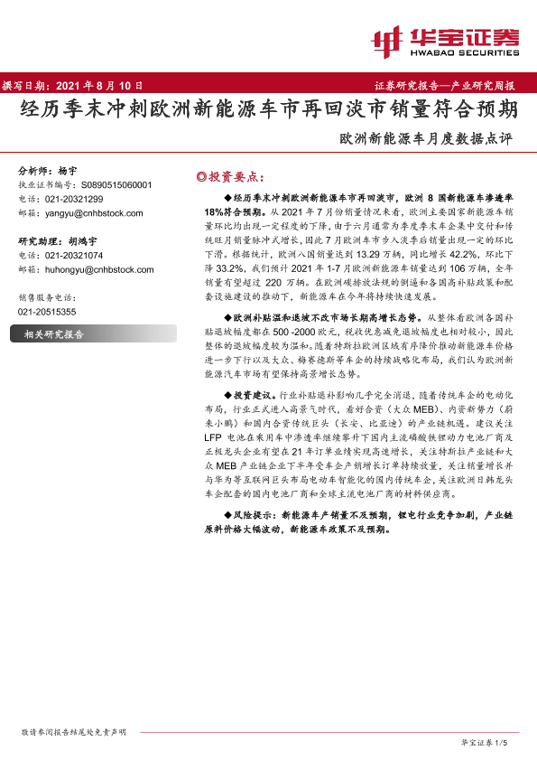 【华宝证券】【20210810】欧洲新能源车月度数据点评:经历季末冲刺欧洲新能源车市再回淡市销量符合预期-5页