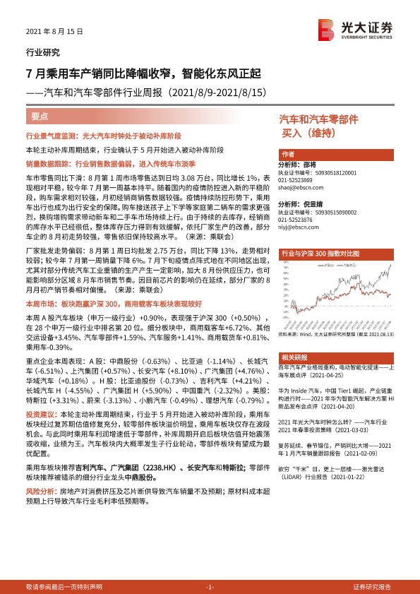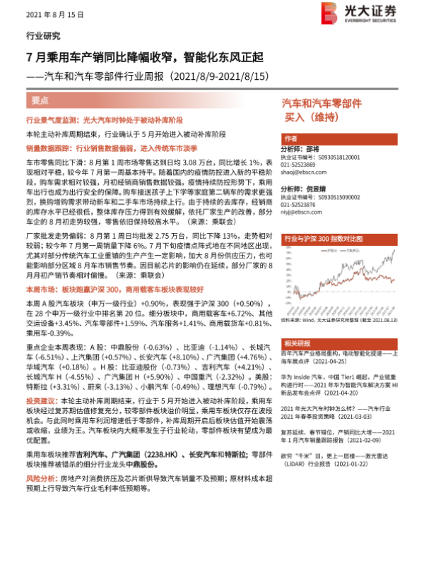 【光大证券】【20210815】汽车和汽车零部件行业周报:7月乘用车产销同比降幅收窄,智能化东风正起-20页