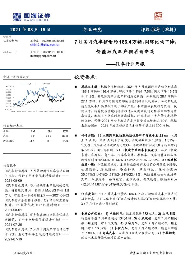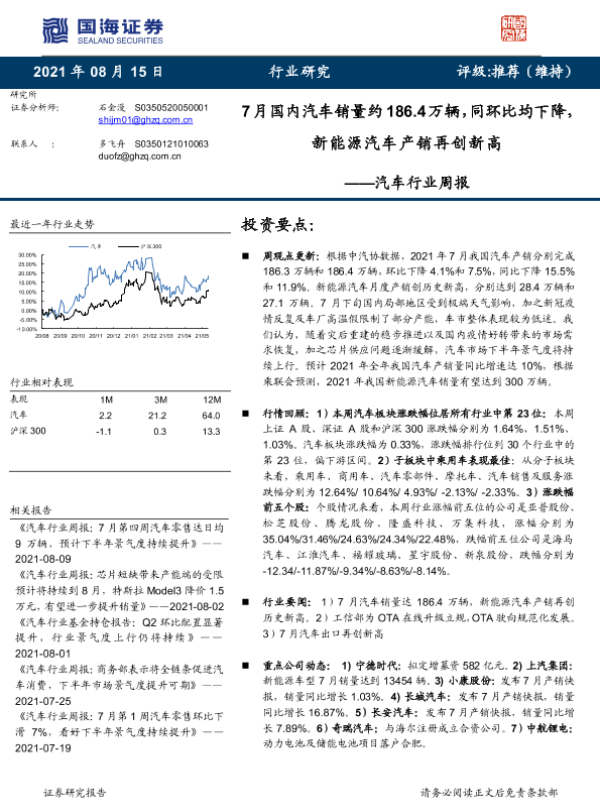 【国海证券】【20210815】20210815-国海证券-汽车行业周报:7月国内汽车销量约186.4万辆,同环比均下降,新能源汽车产销再创新高-13页