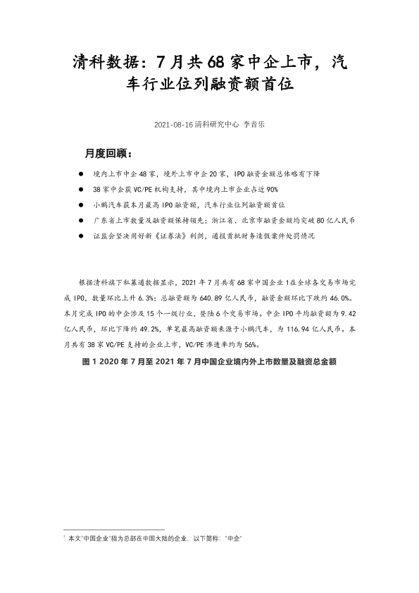 【清科研究中心】【20210816】清科数据:7月共68家中企上市,汽车行业位列融资额首位-13页