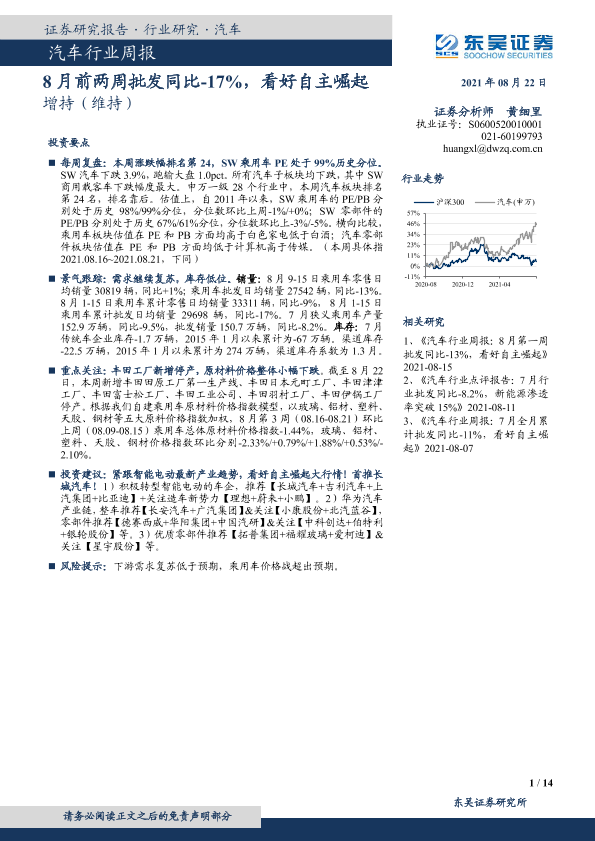 【东吴证券】【20210822】20210822-东吴证券-汽车行业周报:8月前两周批发同比-17%,看好自主崛起-14页