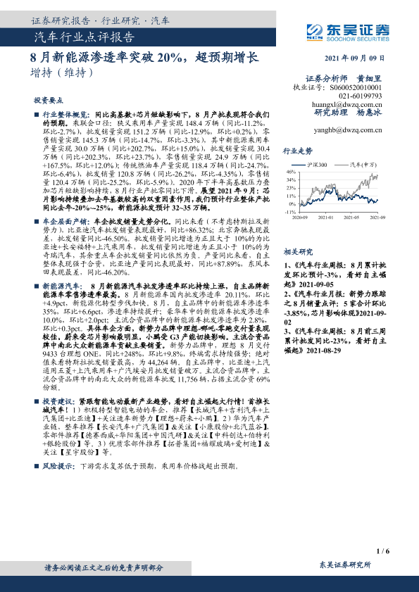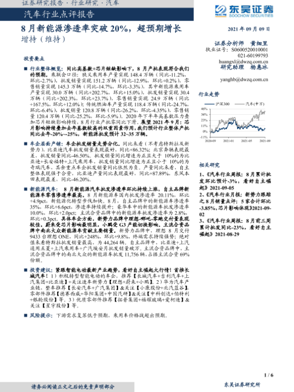【东吴证券】【20210909】20210909-东吴证券-汽车行业点评报告:8月新能源渗透率突破20%,超预期增长-6页