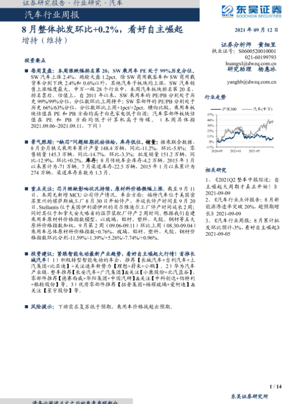 【东吴证券】【20210912】20210912-东吴证券-汽车行业周报:8月整体批发环比+0.2%,看好自主崛起-14页