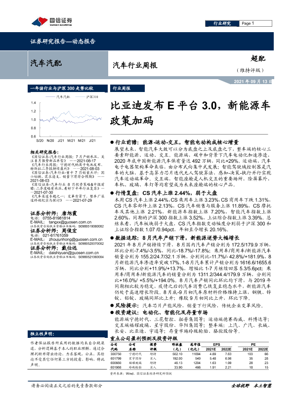 【国信证券】【20210913】汽车行业周报:比亚迪发布E平台3.0,新能源车政策加码-22页