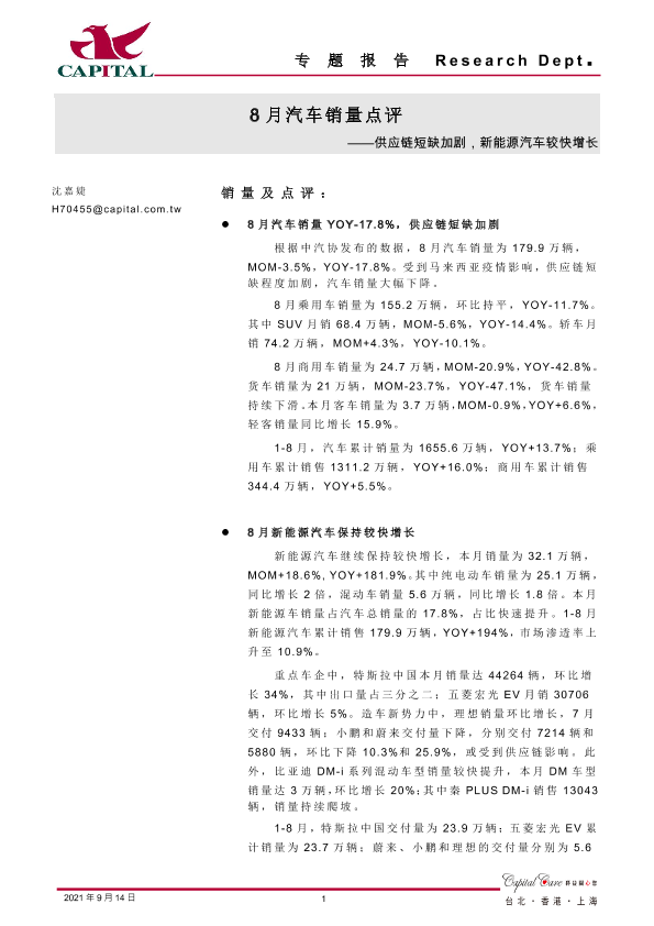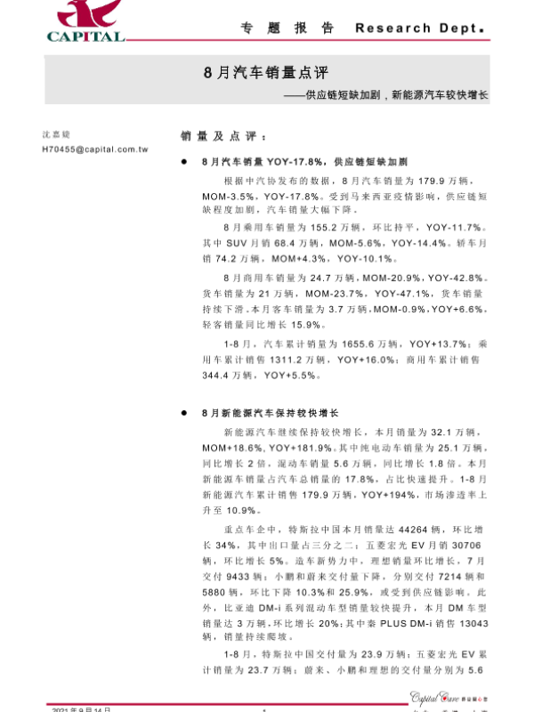 【群益证券】【20210914】8月汽车销量点评:供应链短缺加剧,新能源汽车较快增长-3页