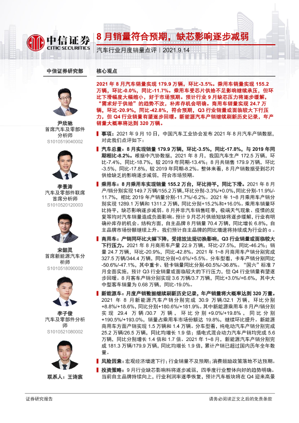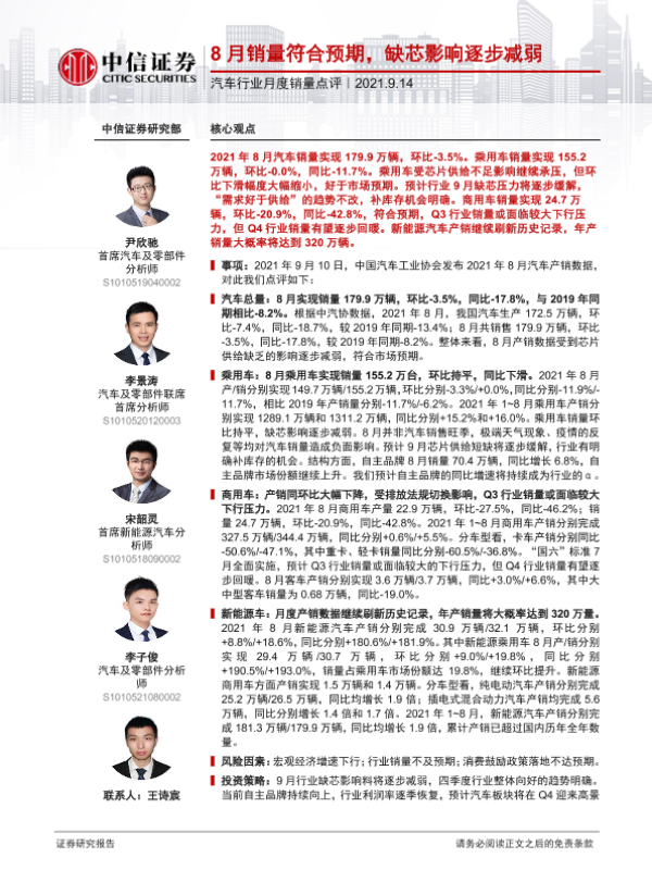 【中信证券】【20210914】20210914-中信证券-汽车行业月度销量点评:8月销量符合预期,缺芯影响逐步减弱-3页