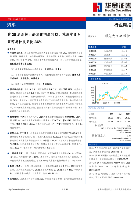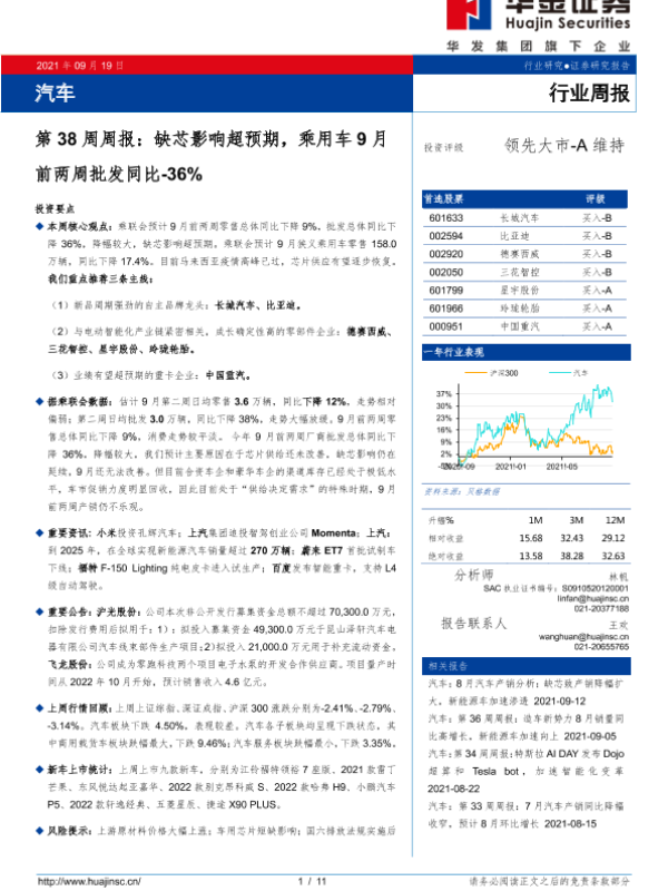 【华金证券】【20210919】汽车第38周周报:缺芯影响超预期,乘用车9月前两周批发同比-36%-11页