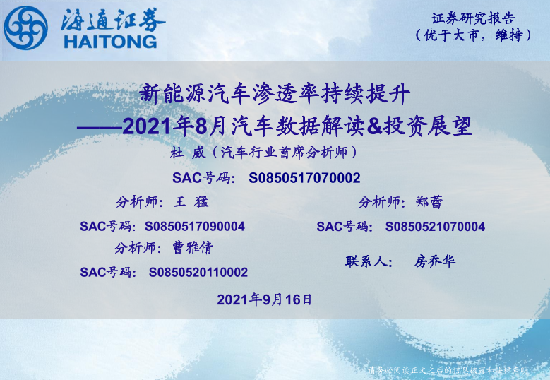 【海通证券】【20210916】2021年8月汽车数据解读&投资展望:新能源汽车渗透率持续提升-23页