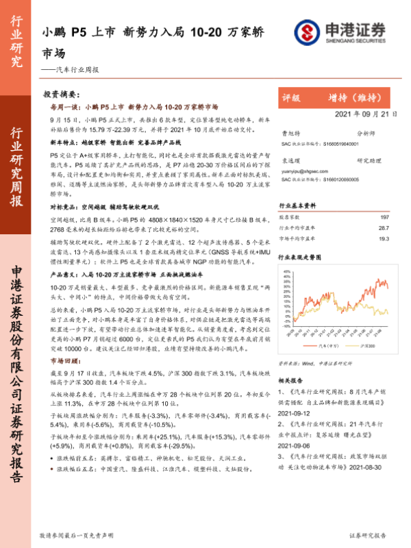 【申港证券】【20210921】20210921-申港证券-汽车行业周报:小鹏P5 上市新势力入局10-20万家轿市场-19页