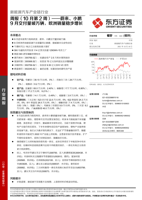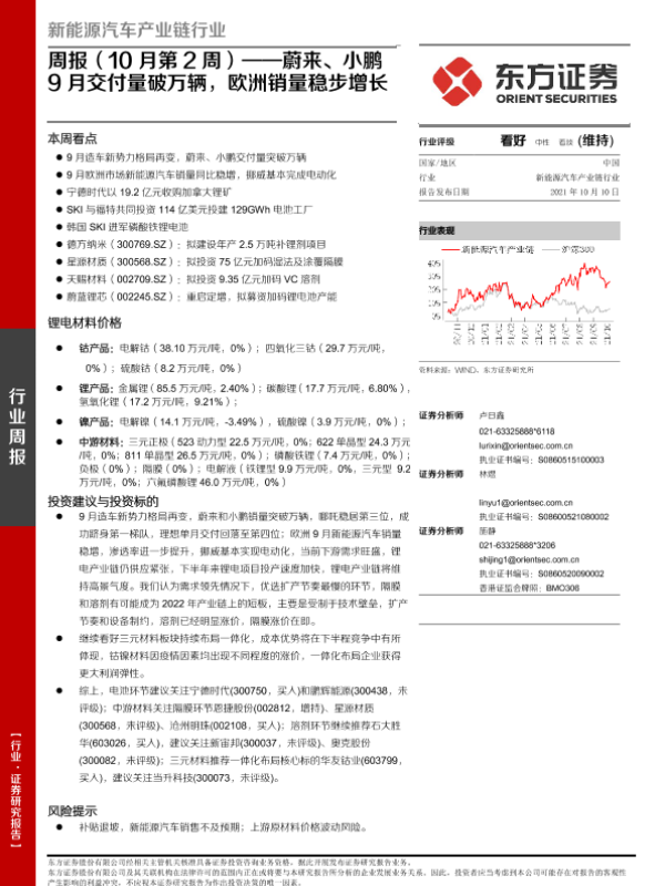 【东方证券】【20211010】新能源汽车产业链行业周报(10月第2周):蔚来、小鹏9月交付量破万辆,欧洲销量稳步增长-34页