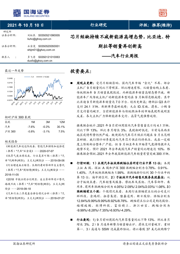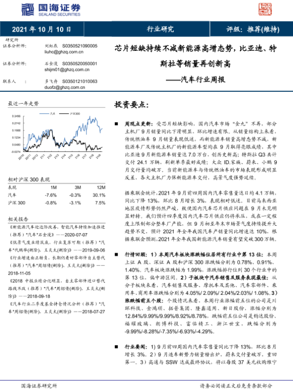 【国海证券】【20211010】芯片短缺持续不减新能源高增态势,比亚迪、特斯拉等销量再创新高-13页