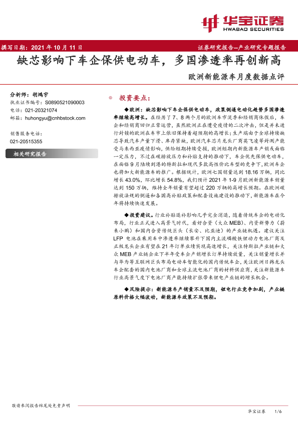 【华宝证券】【20211011】欧洲新能源车月度数据点评:缺芯影响下车企保供电动车,多国渗透率再创新高-6页