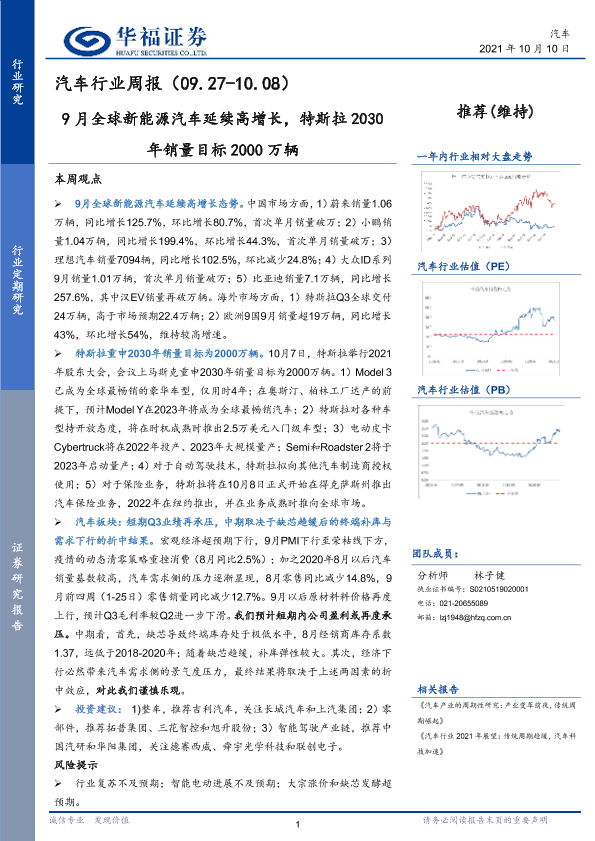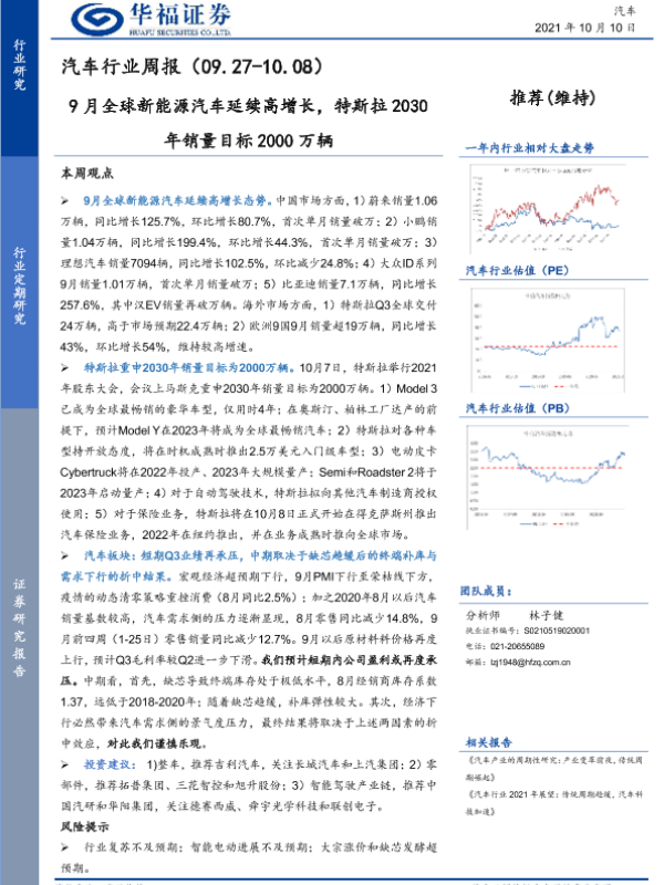 【华福证券】【20211010】汽车行业周报:9月全球新能源汽车延续高增长,特斯拉2030年销量目标2000万辆-8页