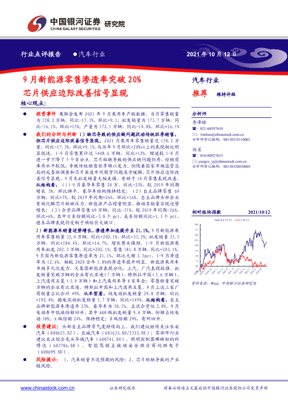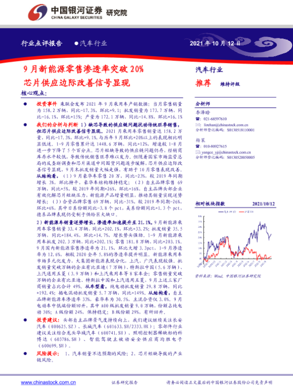 【银河证券】【20211012】20211012-中国银河-汽车行业:9月新能源零售渗透率突破20%,芯片供应边际改善信号显现-2页