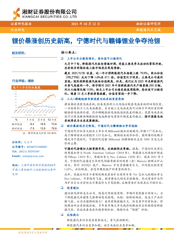 【湘财证券】【20211012】20211012-湘财证券-新能源汽车月报:锂价暴涨创历史新高,宁德时代与赣锋锂业争夺抢锂-11页