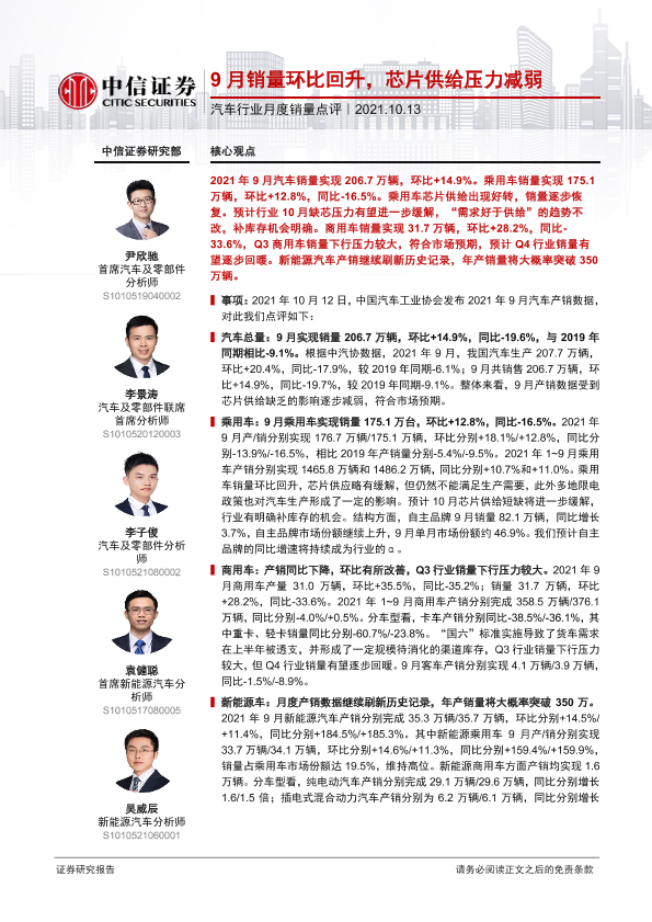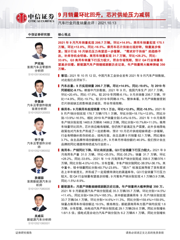 【中信证券】【20211013】汽车行业月度销量点评:9月销量环比回升,芯片供给压力减弱-4页