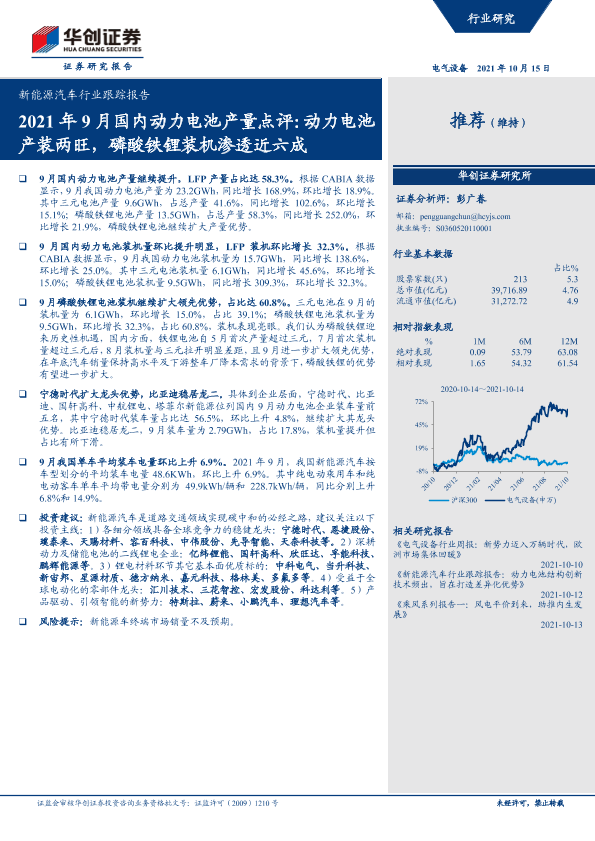 【华创证券】【20211015】2021年9月国内动力电池产量点评:动力电池产装两旺,磷酸铁锂装机渗透近六成-11页