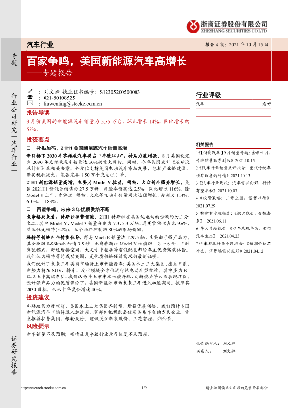 【浙商证券】【20211015】汽车行业专题报告:百家争鸣,美国新能源汽车高增长-9页