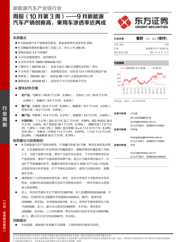【东方证券】【20211017】20211017-东方证券-新能源汽车产业链行业周报(10月第3周):9月新能源汽车产销创新高,乘用车渗透率近两成-31页