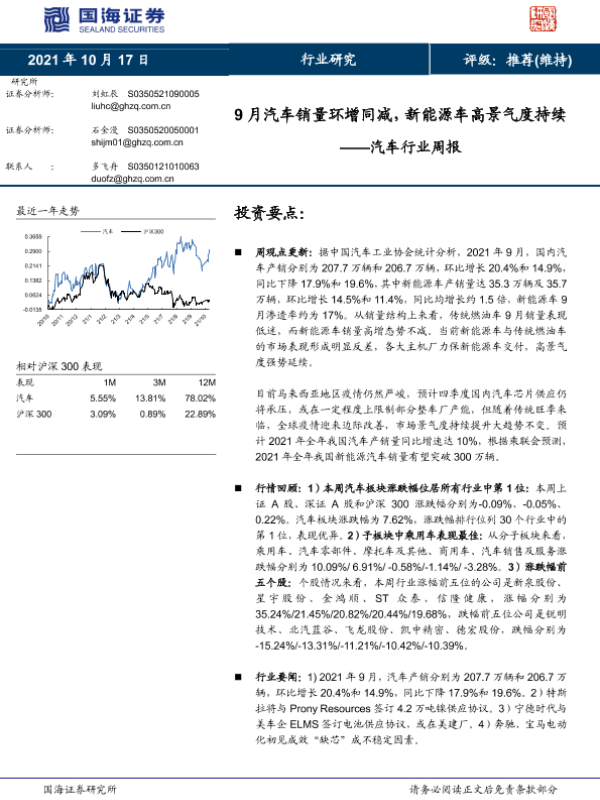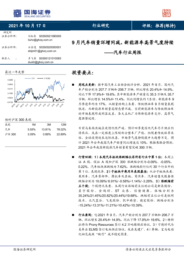 【国海证券】【20211017】9月汽车销量环增同减,新能源车高景气度持续——汽车行业周报-14页