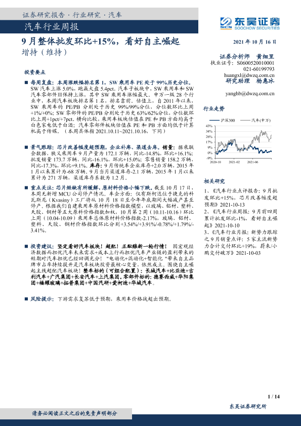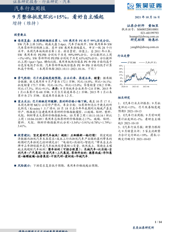 【东吴证券】【20211016】20211016-东吴证券-汽车行业周报:9月整体批发环比+15%,看好自主崛起-14页