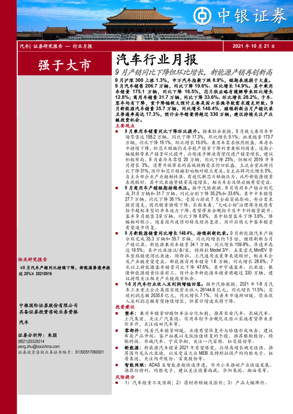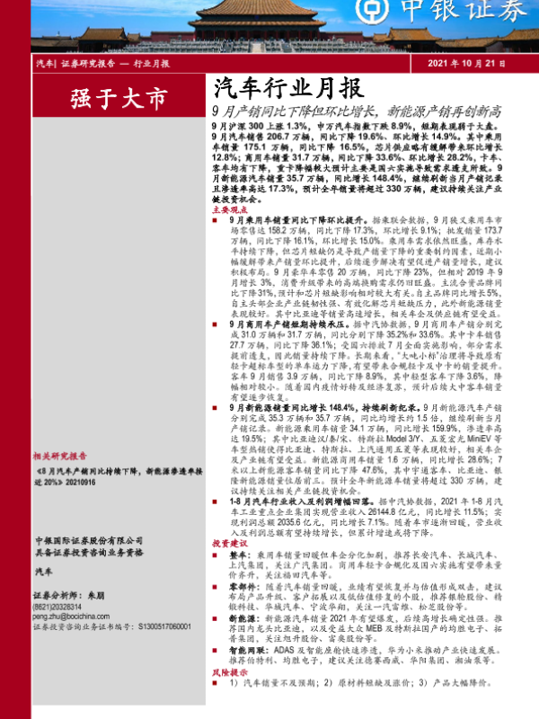 【中银证券】【20211021】20211021-中银证券-汽车行业月报:9月产销同比下降但环比增长,新能源产销再创新高-15页