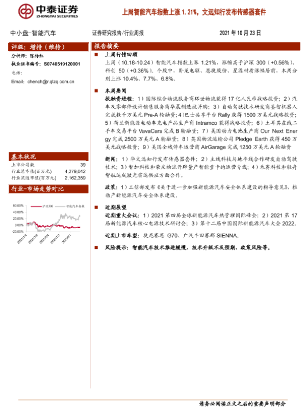 【中泰证券】【20211023】20211023-中泰证券-中小盘-智能汽车行业周报:上周智能汽车指数上涨1.21%,文远知行发布传感器套件-7页