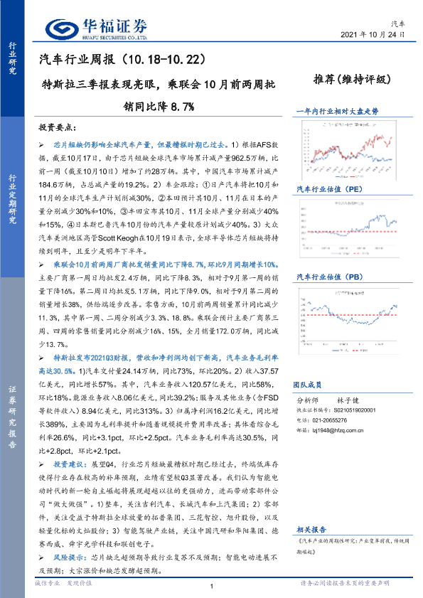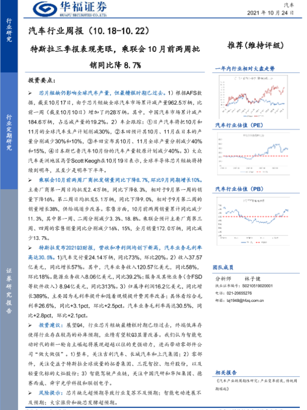 【华福证券】【20211024】20211024-华福证券-汽车行业周报:特斯拉三季报表现亮眼,乘联会10月前两周批销同比降8.7%-8页