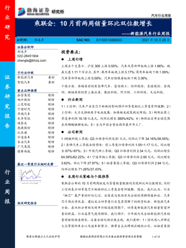 【渤海证券】【20211025】20211025-渤海证券-新能源汽车行业周报:乘联会:10月前两周销量环比双位数增长-10页