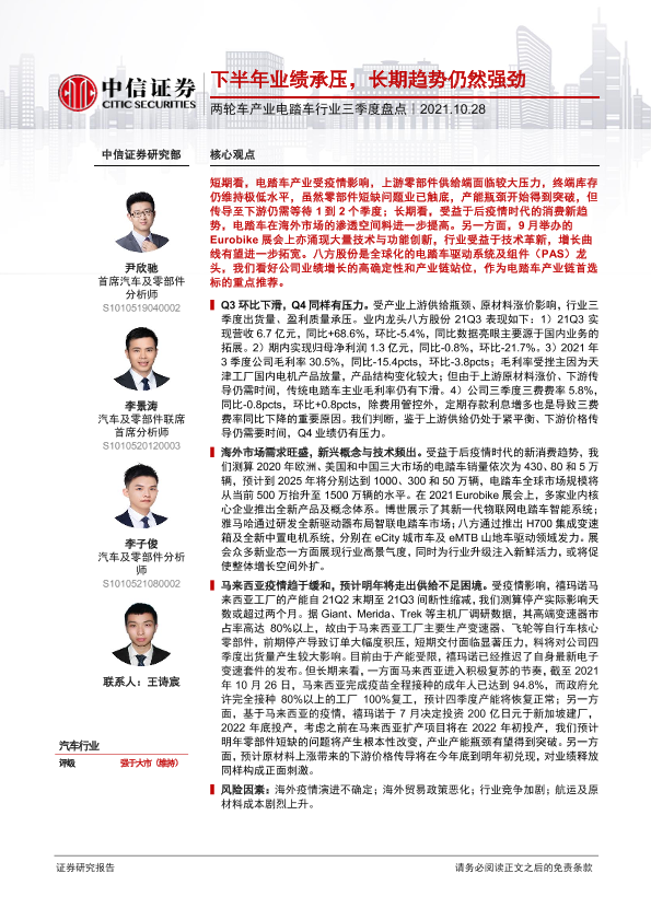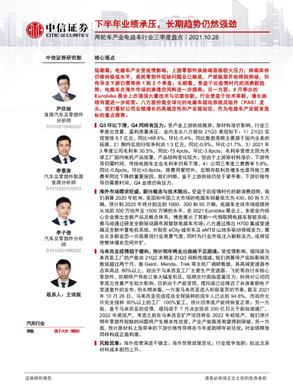 【中信证券】【20211028】汽车行业两轮车产业电踏车行业三季度盘点:下半年业绩承压,长期趋势仍然强劲-3页