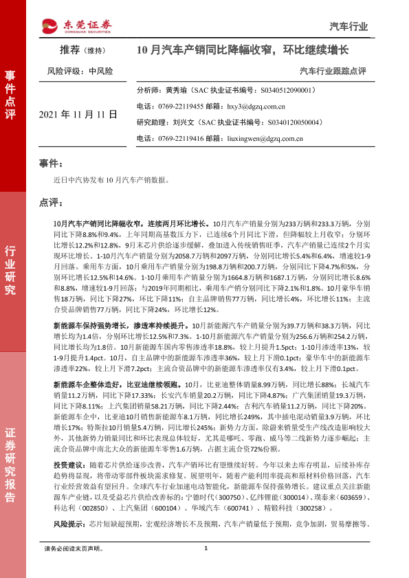 【东莞证券】【20211111】汽车行业跟踪点评:10月汽车产销同比降幅收窄,环比继续增长-3页
