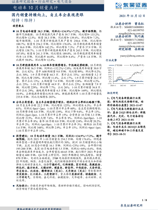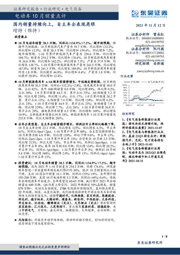 【东吴证券】【20211112】电动车10月销量点评:国内销量持续向上,自主车企表现亮眼-8页