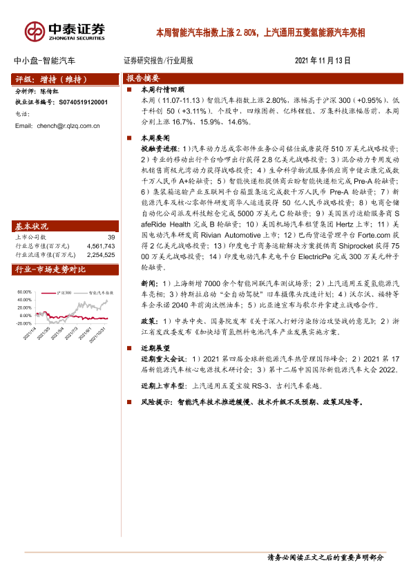 【中泰证券】【20211113】20211113-中泰证券-中小盘-智能汽车行业周报:本周智能汽车指数上涨2.80%,上汽通用五菱氢能源汽车亮相-8页