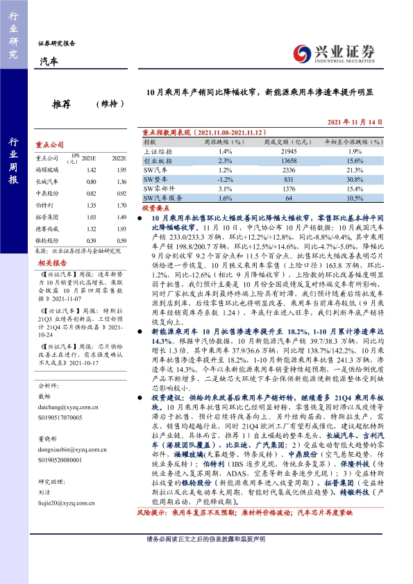 【兴业证券】【20211114】10月乘用车产销同比降幅收窄,新能源乘用车渗透率提升明显-27页