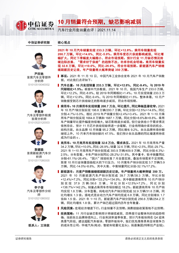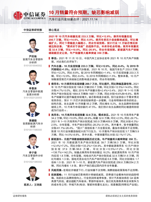 【中信证券】【20211114】20211114-中信证券-汽车行业月度销量点评:10月销量符合预期,缺芯影响减弱-3页