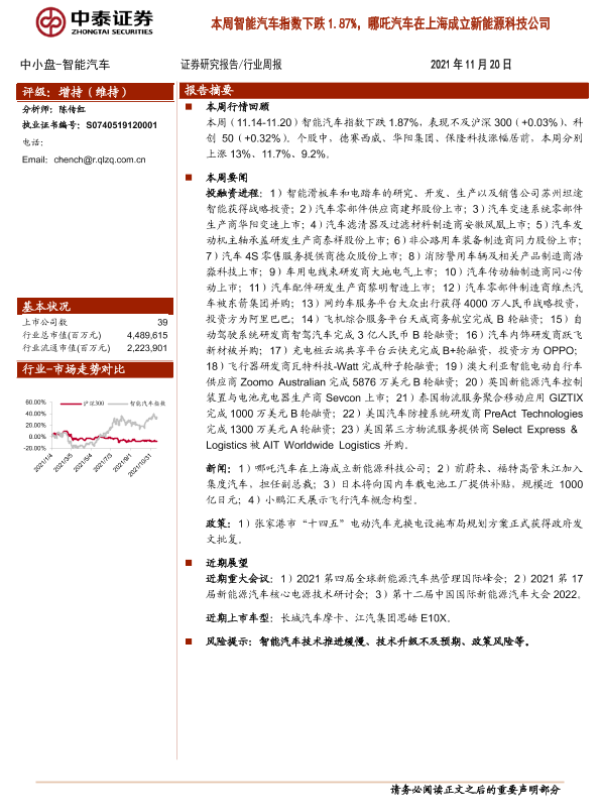【中泰证券】【20211120】20211120-中泰证券-智能汽车行业周报:本周智能汽车指数下跌1.87%,哪吒汽车在上海成立新能源科技公司-8页