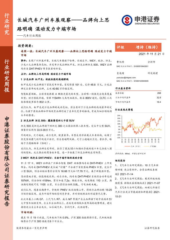 【申港证券】【20211121】20211121-申港证券-汽车行业周报:长城汽车广州车展观察-品牌向上思路明确 混动发力中端市场-20页